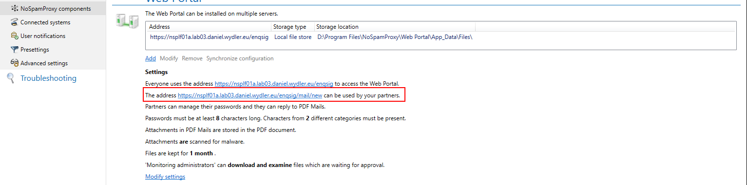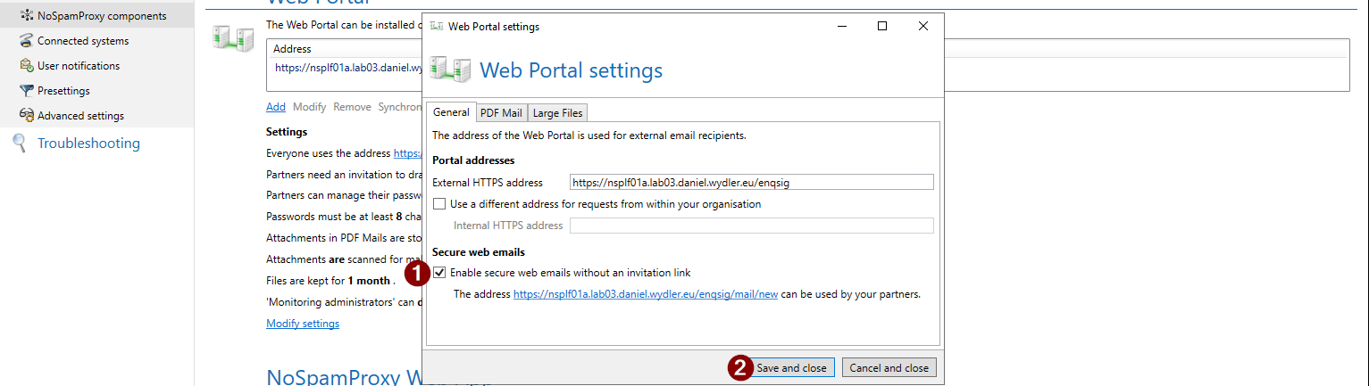 Die Funktion „Secure web emails“ ohne Einladungslink zu verwenden ist standardmäßig deaktiviert. Diese kann über das NoSpamProxy Command Center aktiviert werden.