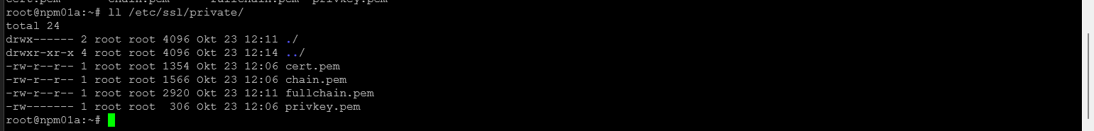 Anschließend habe ich ein für den FQDN passendes SSL-Zertifikat direkt auf der VM abgerufen. Die Dateien habe ich auf der VM unter /etc/ssl/private/ abgelegt.