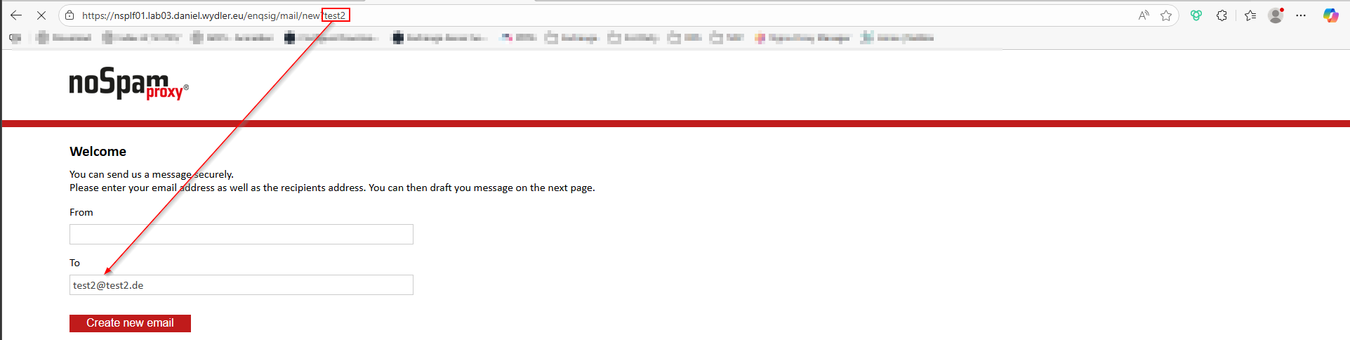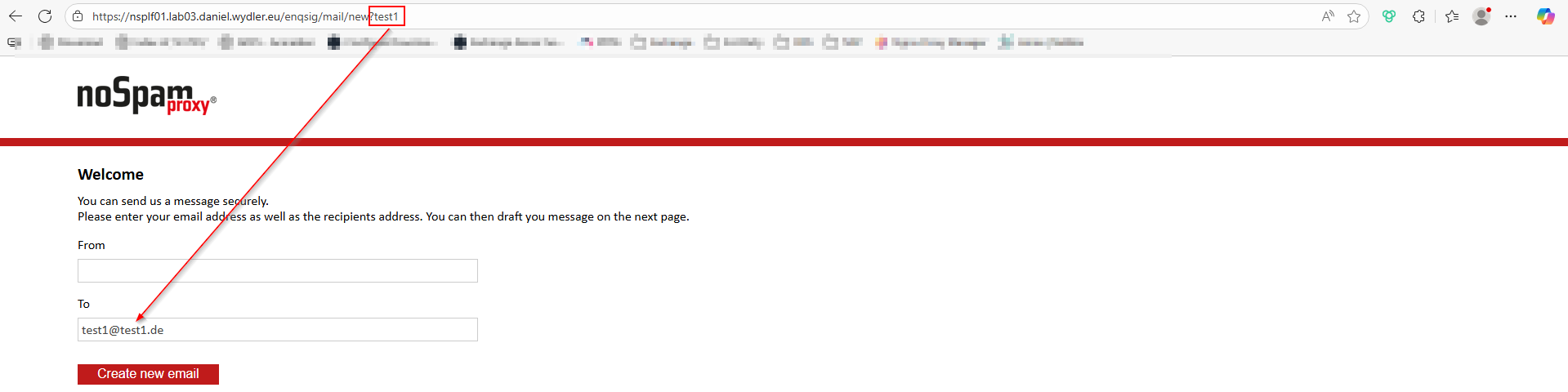 | Fügt man an das Ende der URI den Parameter „test1“ an, wird die E-Mail-Adresse test1@test1.de eingetragen. |
